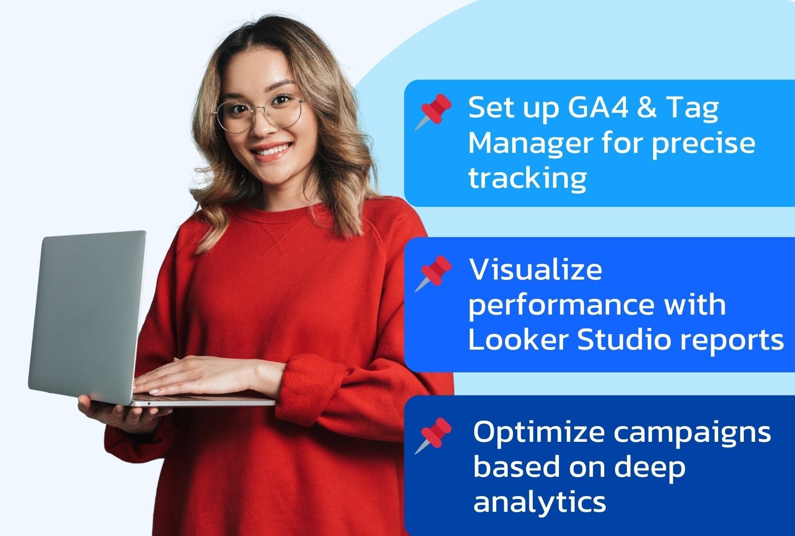 Yes! We specialize in data-driven marketing, offering advanced tracking setup and reporting using Google Tag Manager, Looker Studio, and CRM integrations to measure and optimize your marketing efforts.