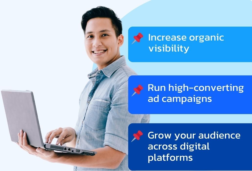 A digital marketing agency helps businesses grow online by increasing visibility, generating high-quality leads, and driving conversions through strategies like Google Ads, Meta Ads, SEO, social media marketing, automation, CRM, and reporting.
